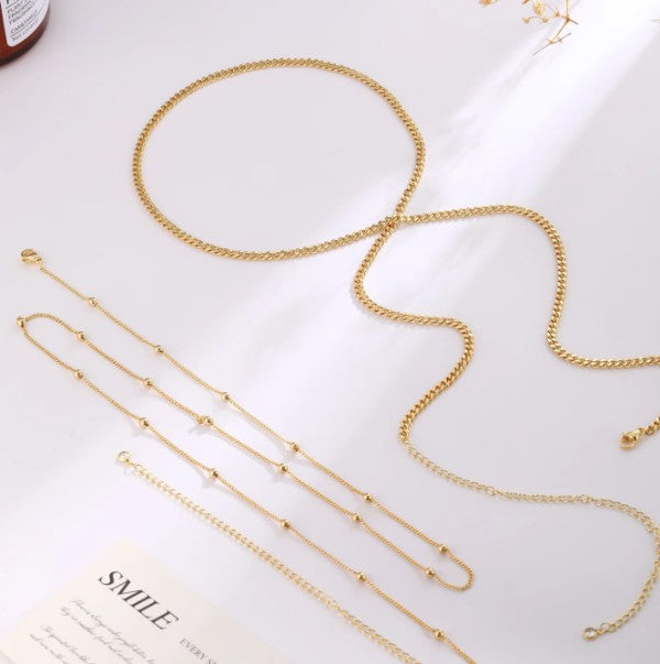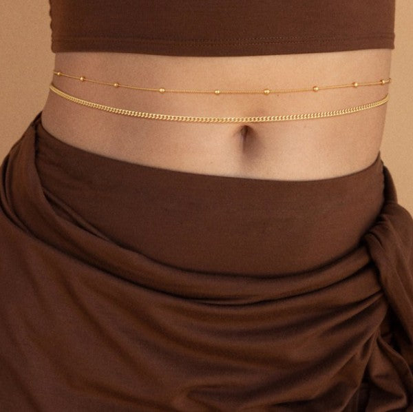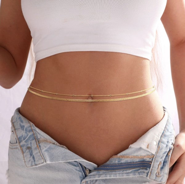 Designed to sit low and move with you, this double-layer waist chain is all about subtle heat. A sleek Figaro chain pairs with a delicate beaded strand, creating contrast that catches the light—and attention—without trying too hard.