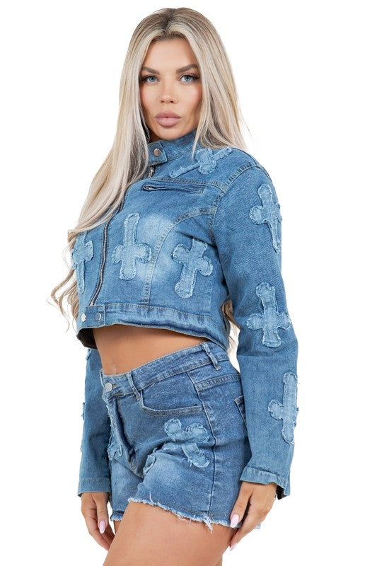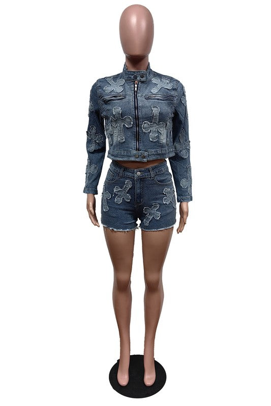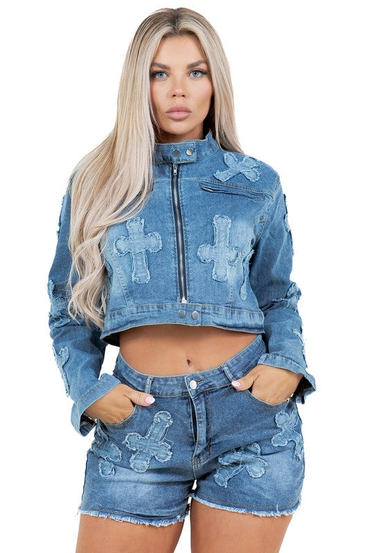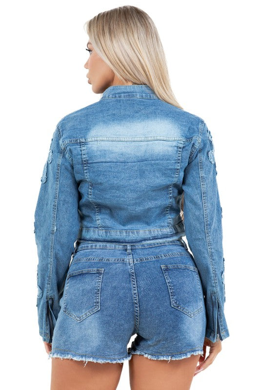 Denim 2pcs set ,Top denim jacket, long sleeve, front zipper up, belt loops hot short