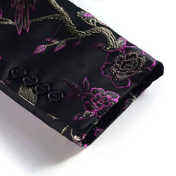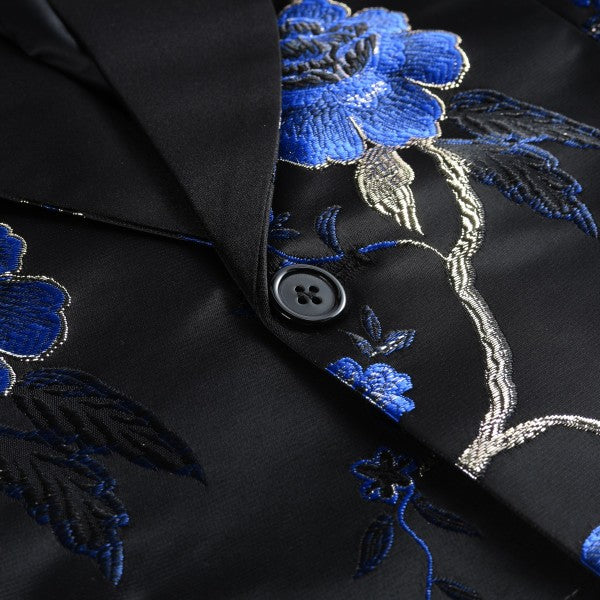 Top - one button, peaked lapel, three sleeve buttons, two flap side pockets, one chest pocket, random cutting exquisite embroidery pattern,Bottom - flat front pants come with adjustable waistband