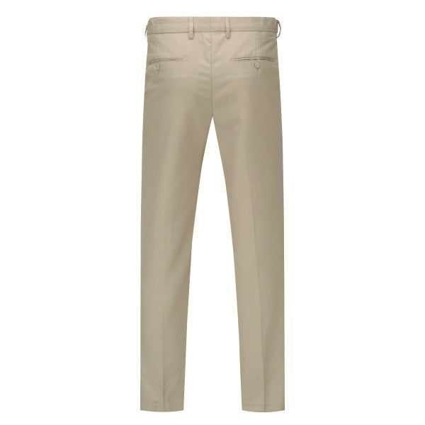 Flat front free length pants come with extended waist strap, slanted side pockets.