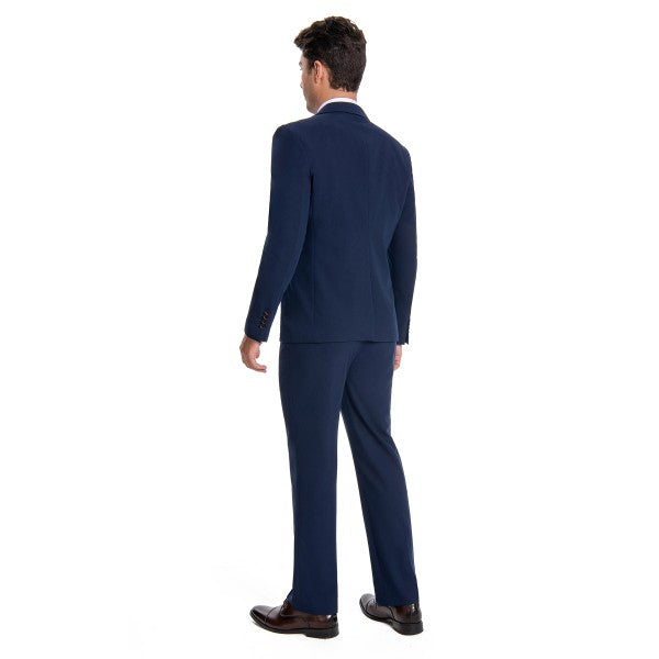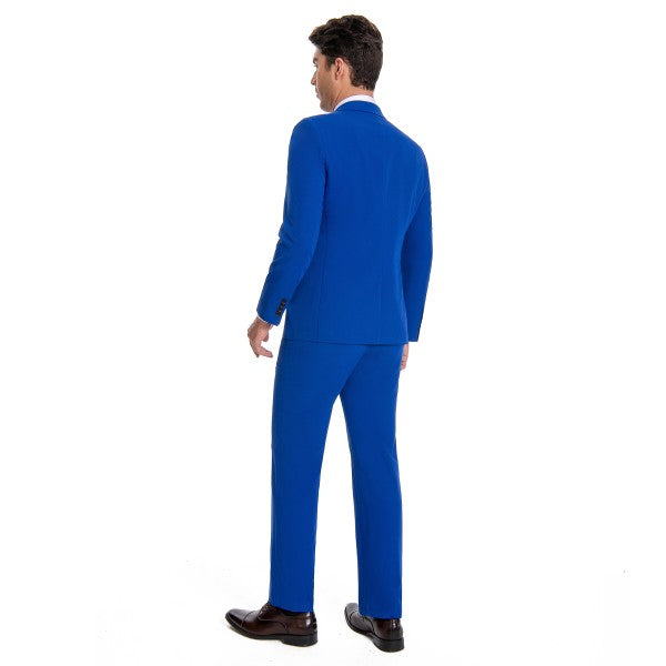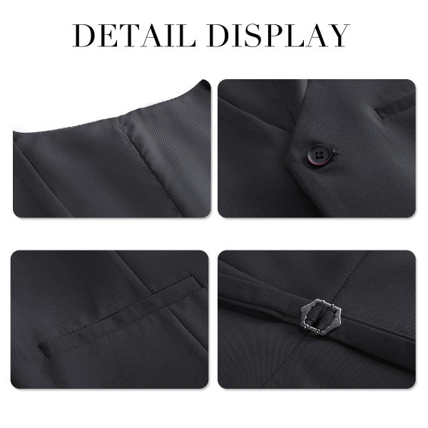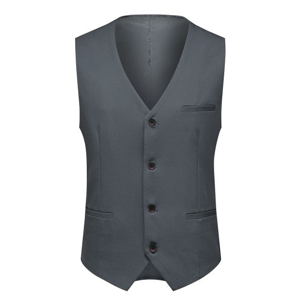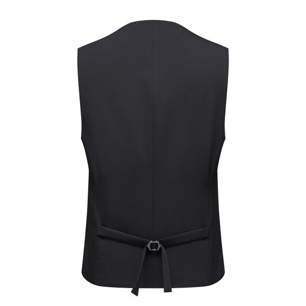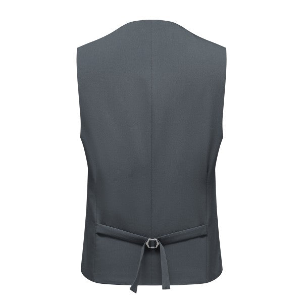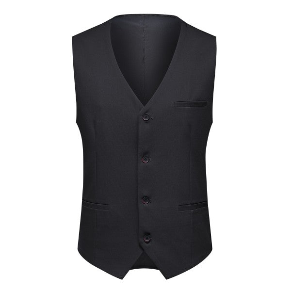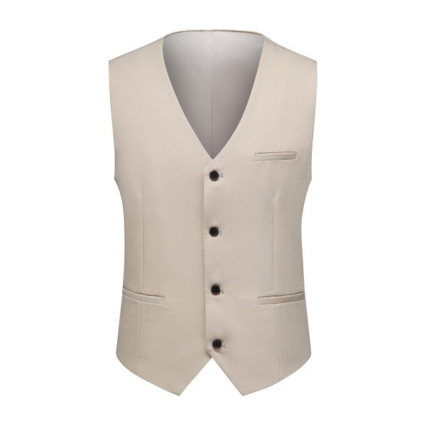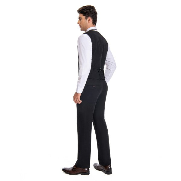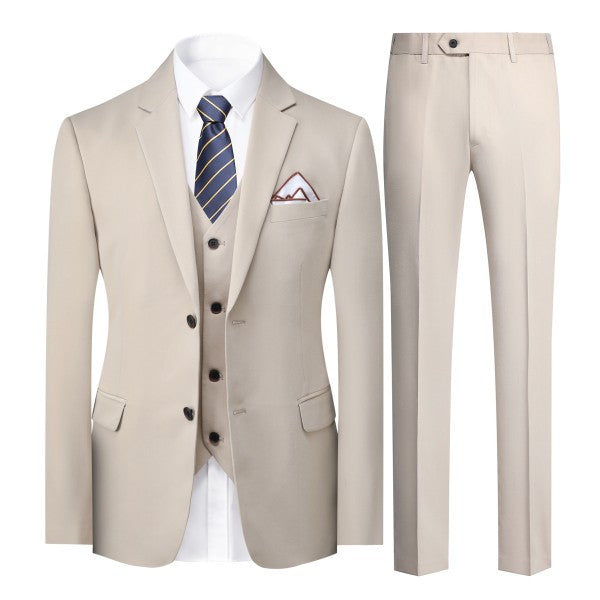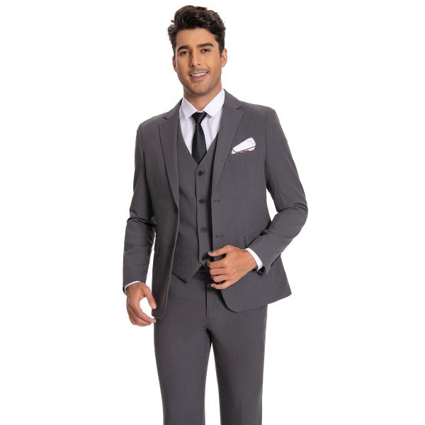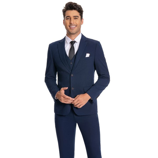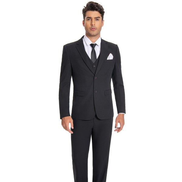Men's 3-piece suit with 2-button closure, notched lapels, single-breasted, 2 flap pockets, 1 chest pocket, 2 inner pockets, 4-button cuffs, V-neck vest, pleated-front pants.
