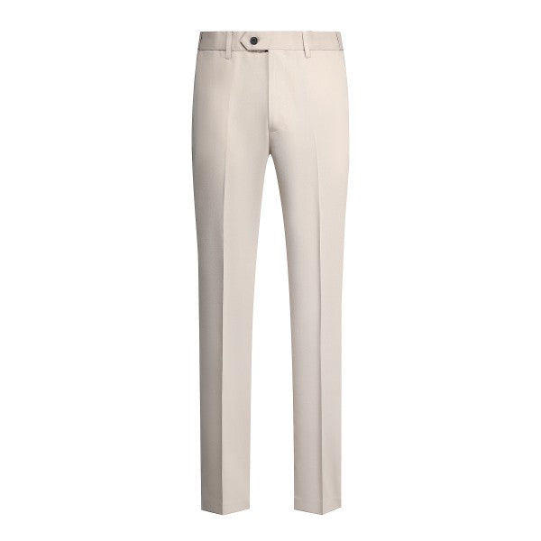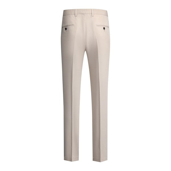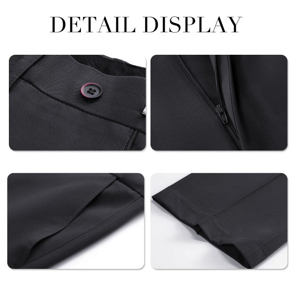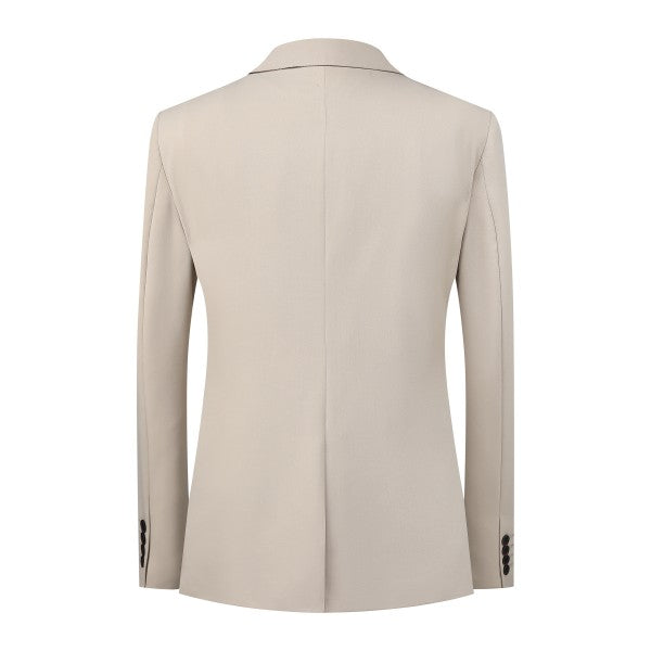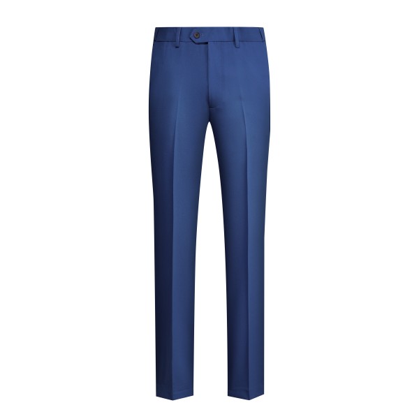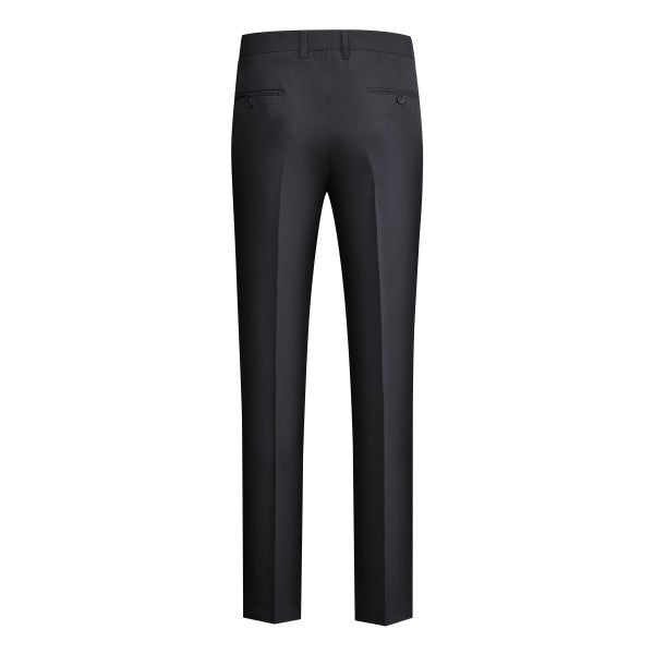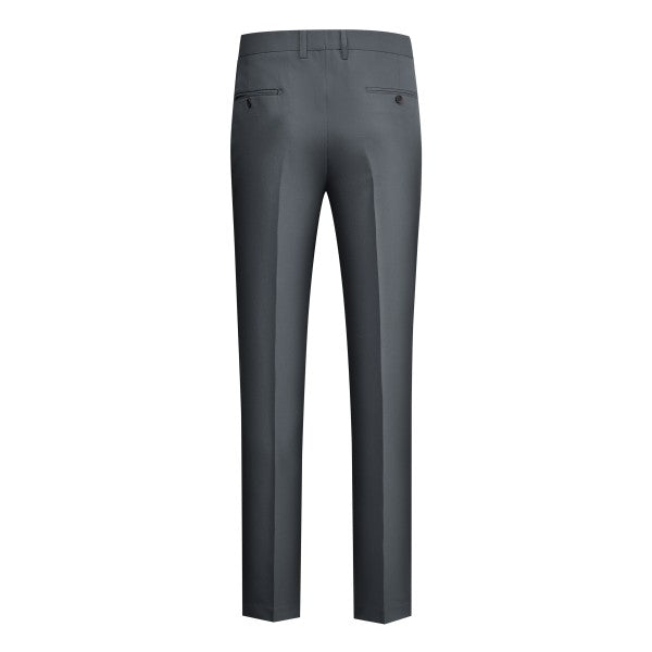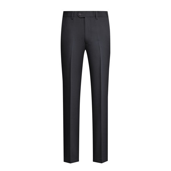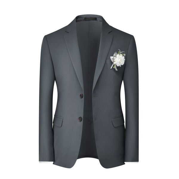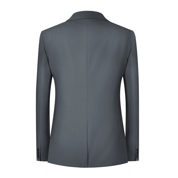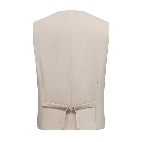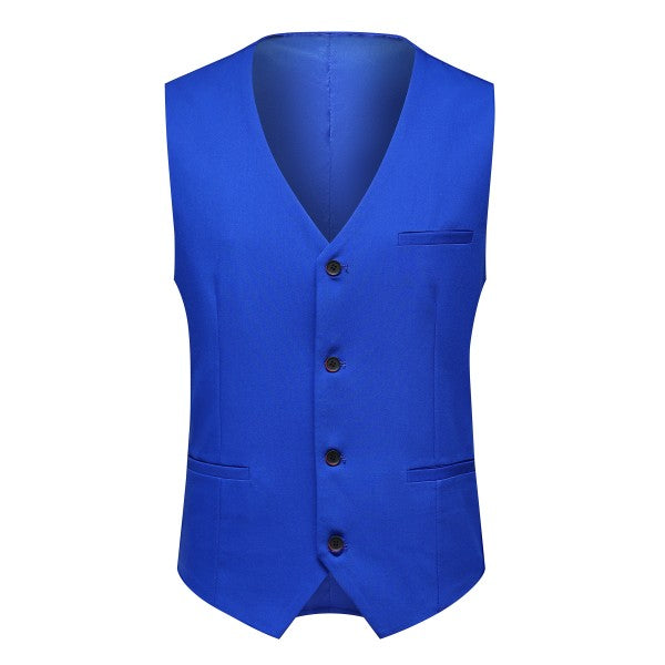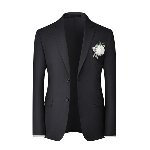 Men's 3-piece suit with 2-button closure, notched lapels, single-breasted, 2 flap pockets, 1 chest pocket, 2 inner pockets, 4-button cuffs, V-neck vest, pleated-front pants.