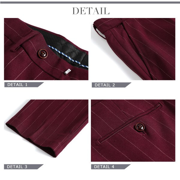 This stripe suit has notched lapels, single-breasted with two-button closure, long sleeves, lightly padded on the shoulders, 2 utility side flap pockets, a chest pocket, 4-button cuffs, these pants featrues two slant pockets, adjustable waist band, button-closure back pockets.
