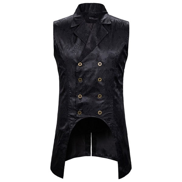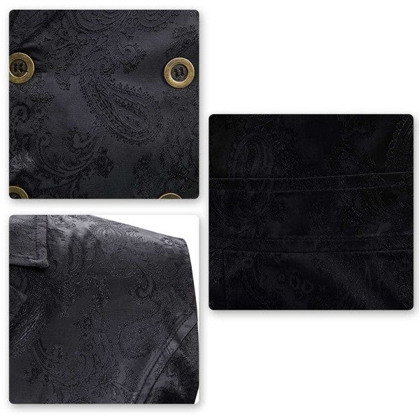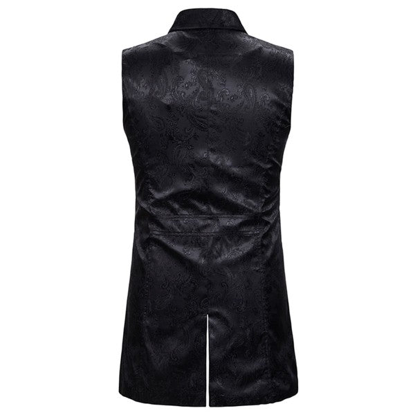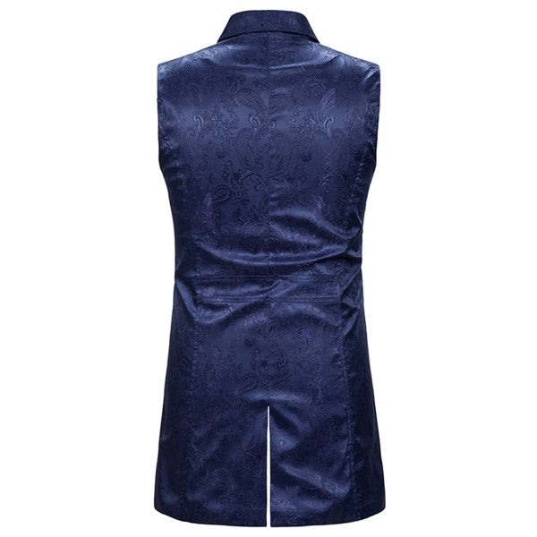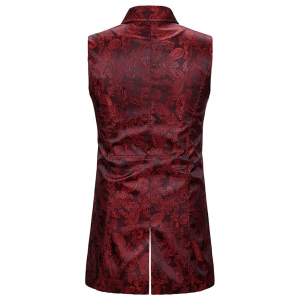 Slim fit jacquard brocade suit vest with classic notched lapel, double breasted, back vent, 4 buttons front closure and 4 decorative buttons, features elegant paisley embroidery pattern design, well construction offers a sharp looking , With black, red and navy blue colors available.