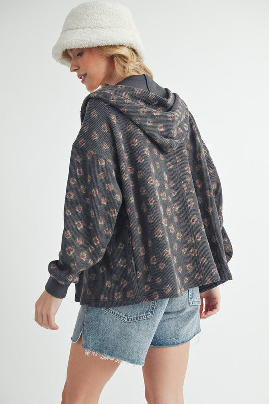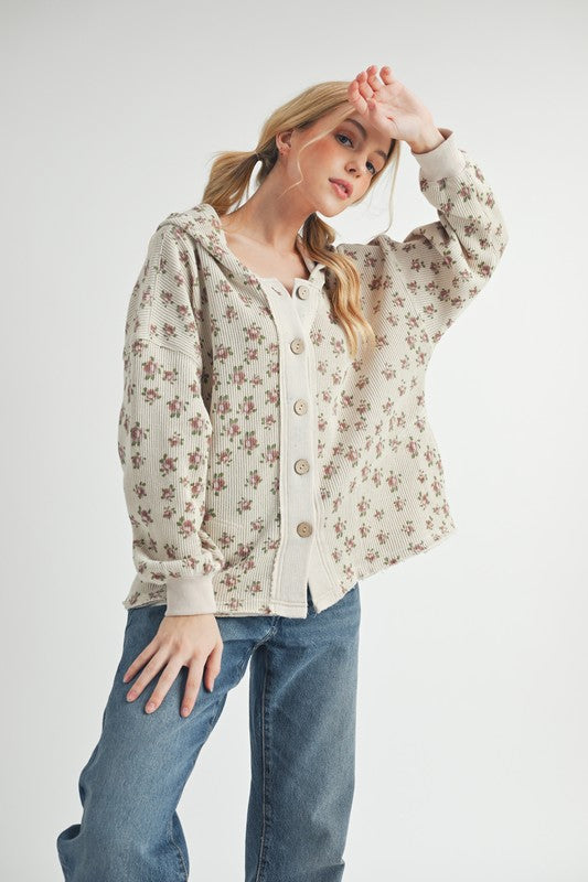 Designed for versatility, the Kamilah hooded jacket showcases a boxy fit, floral print, and a button-front with a contrasting placket. Raw hem detailing throughout adds to its effortlessly stylish appeal.
