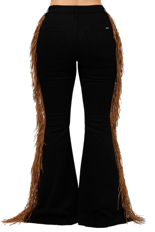 Full length 5 Pocket Bell Bottom Jean features side fringe detail, front and back functional pockets, front button and zipper closure, stretch denim, Black Denim, Made in USA