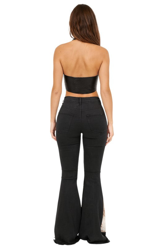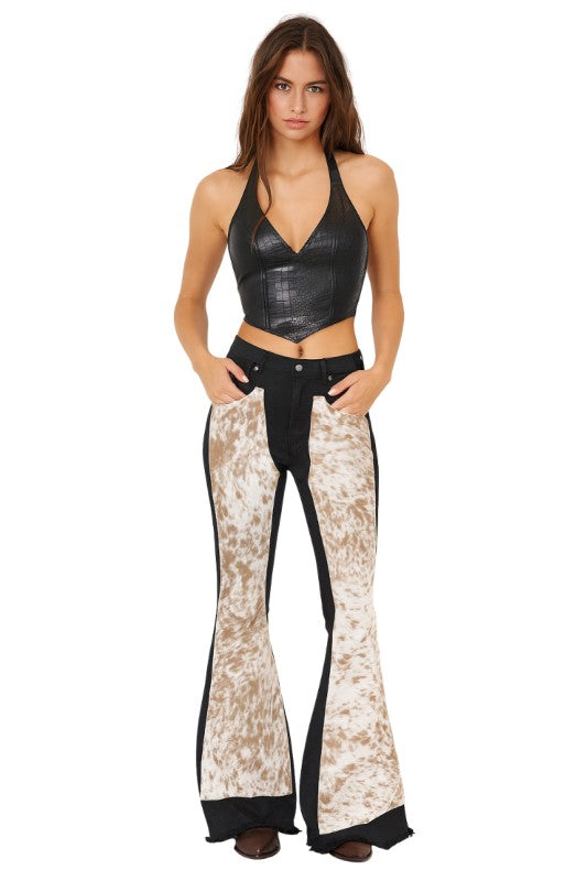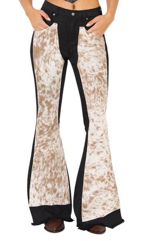 Turn heads in these statement-making women's flare jeans with cowhide front panels, blending bold Western style with modern edge. Featuring faux cowhide-inspired paneling, a flattering high-rise fit, and raw hem detailing, these jeans are perfect for festivals, concerts, or everyday streetwear with a rustic twist. The black denim base contrasts beautifully with the cowhide print, giving a chic yet rugged look that pairs effortlessly with boots or heels. Made with quality craftsmanship and designed for comfort, these standout flares bring cowboy glam to your wardrobe.