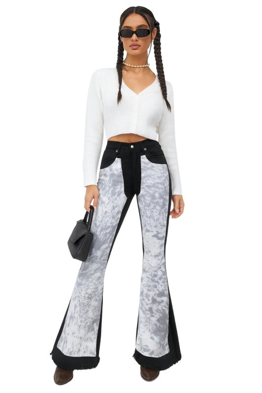 Turn heads in these statement-making women's flare jeans with cowhide front panels, blending bold Western style with modern edge. Featuring faux cowhide-inspired paneling, a flattering high-rise fit, and raw hem detailing, these jeans are perfect for festivals, concerts, or everyday streetwear with a rustic twist. The black denim base contrasts beautifully with the cowhide print, giving a chic yet rugged look that pairs effortlessly with boots or heels. Made with quality craftsmanship and designed for comfort, these standout flares bring cowboy glam to your wardrobe.