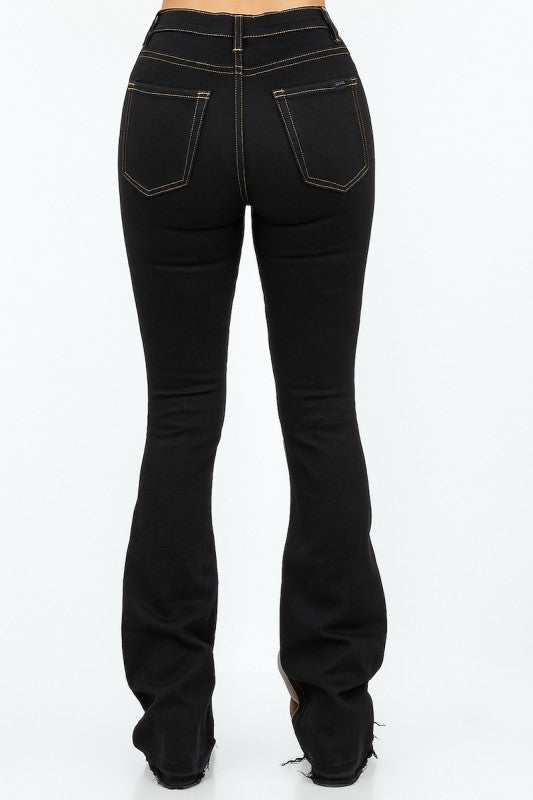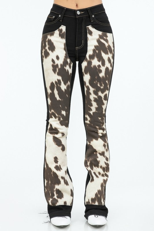 Turn heads with these trend-forward bootcut jeans, expertly crafted in the USA. Featuring a flattering high rise fit, these jeans showcase bold cow hide patchwork details that bring a Western edge to classic denim. The bootcut silhouette elongates the legs and pairs perfectly with boots, heels, or sneakers for versatile styling. Made with quality craftsmanship and premium denim, these jeans are as durable as they are stylish.