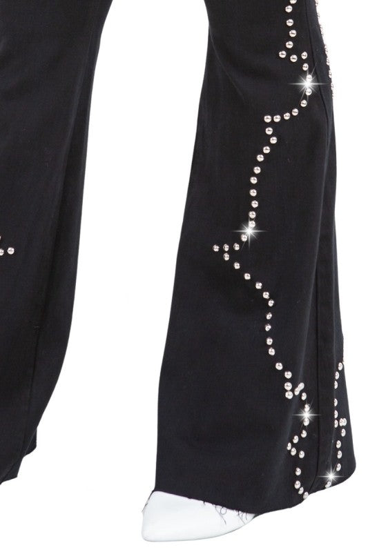 Say hello to the Santa Fe Bell Bottom Jean! These jeans have front and back pockets, including a classic front coin pocket. The front button and zipper closure keeps everything secure. Made from a premium stretch fabric and dyed in our very own dye house in Los Angeles. The front and back also have stylish silver stud details, carefully hand-pierced one by one in our own factory. And don't forget the frayed hem for an added touch. Cut, sewn, dyed, and packed right here in the USA! #ProudlyMadeInUSA