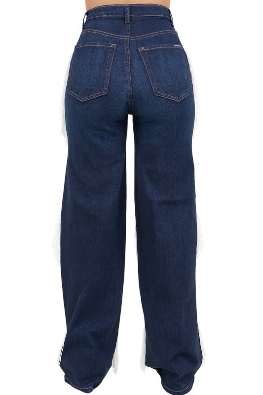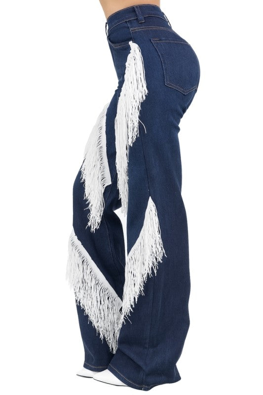 Unleash your inner cowgirl with these show-stopping wide leg denim jeans featuring bold suede fringe detailing. Proudly made in the USA, these jeans bring modern Western fashion to life with layered fringe that moves with every step. The high-waisted fit and flattering bootcut leg make them the perfect pair for concerts, rodeos, festivals, or a standout streetwear look.