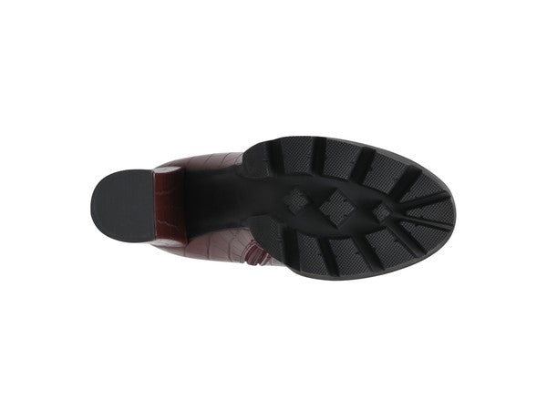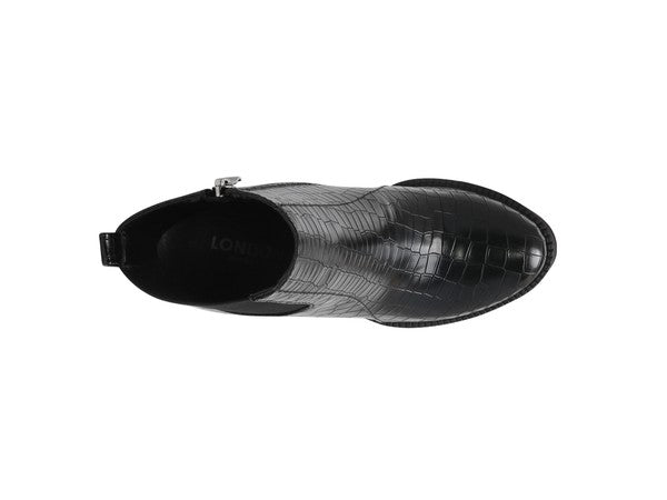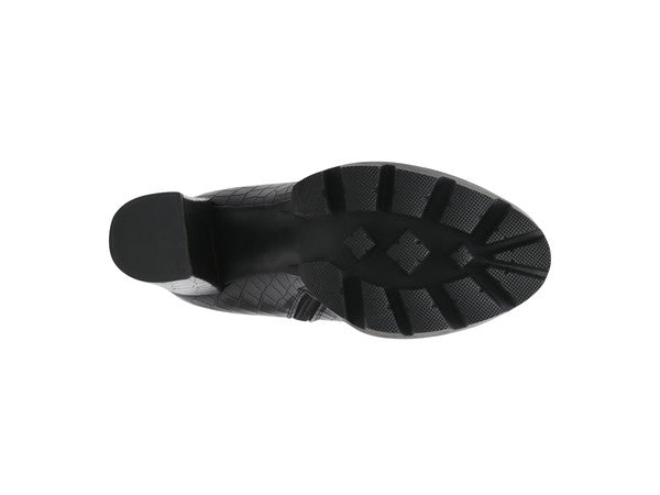 Make sure your wardrobe is new season ready and indulge in a pair of simplistic block heel boots. Showcasing a croc print with a round-toe design & zip closure along with back pull tab for convenient wear. Complete your look by wearing these boots with mini dress. It's a perfect wear for a camping night this festive season