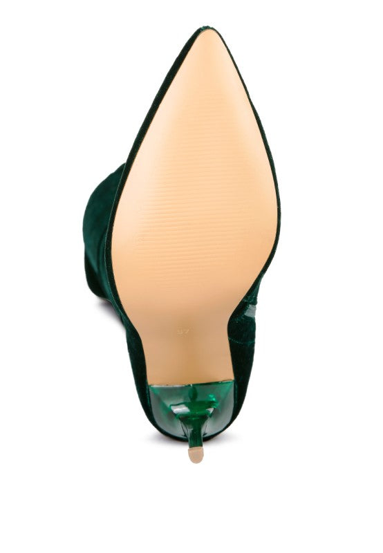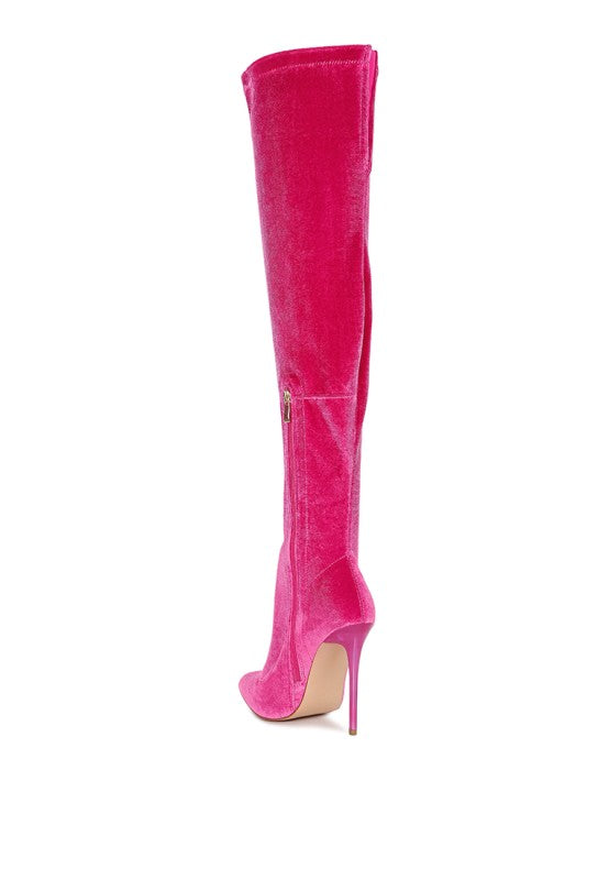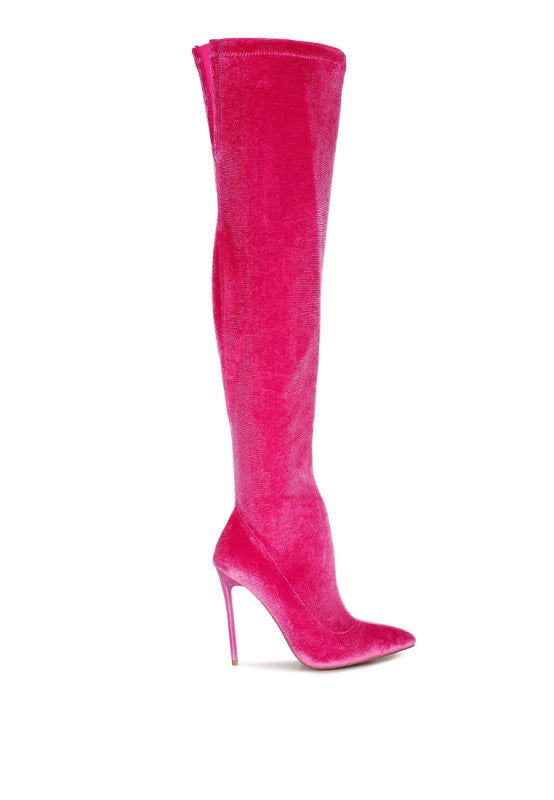 Sleek, shiny, chic! The beautiful stretch high heel boots are a vision to behold with the lovely velvet finish that looks lush. The sharpness of the high heel stilettos and pointed toe is stylish and looks bold and alluring. The light cushion insole also supports feet well and cuts strain.