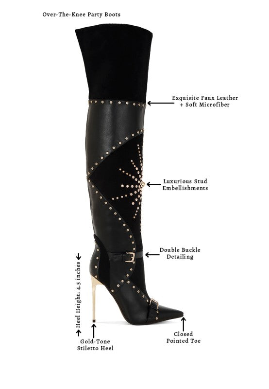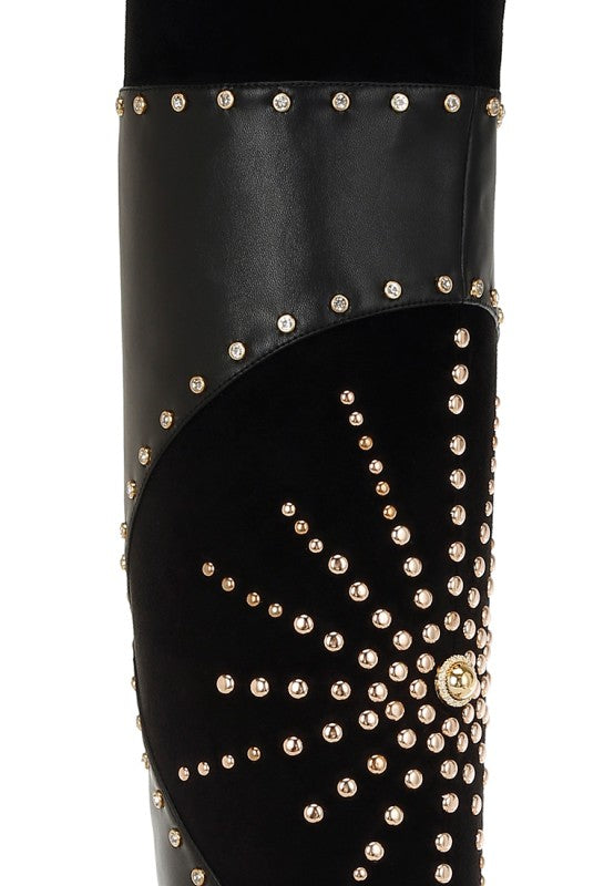 These pointed toe stiletto heel boots are a major statement-maker. The chic stud and diamante embellished motifs add an edgy appeal. Style these with a bodycon dress or a denim skirt and spaghetti top for a sundowner.