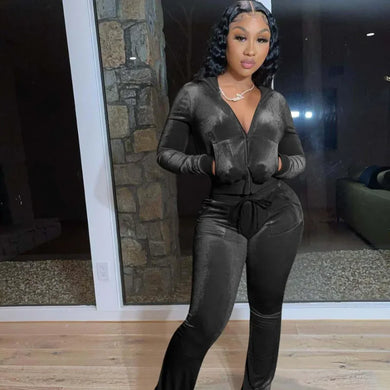 Gold Velvet Pocket Hoodie Zipper Sweater Wide Leg Pants Two-piece