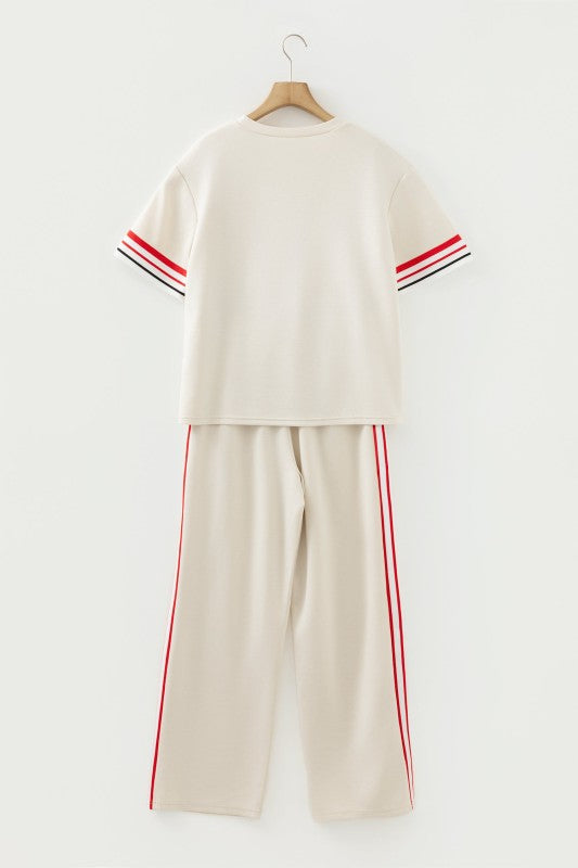 Elevate your casual wardrobe with this effortless 2-piece set. The crewneck tee features contrast striped trim for a sporty-chic vibe, while loose straight-leg pants provide all-day comfort and easy movement. Crafted from soft, breathable fabric, this coordinated duo is perfect for laid-back styling that requires zero effort. Mix, match, or wear together for versatile everyday looks. Polyester/Viscose/Spandex