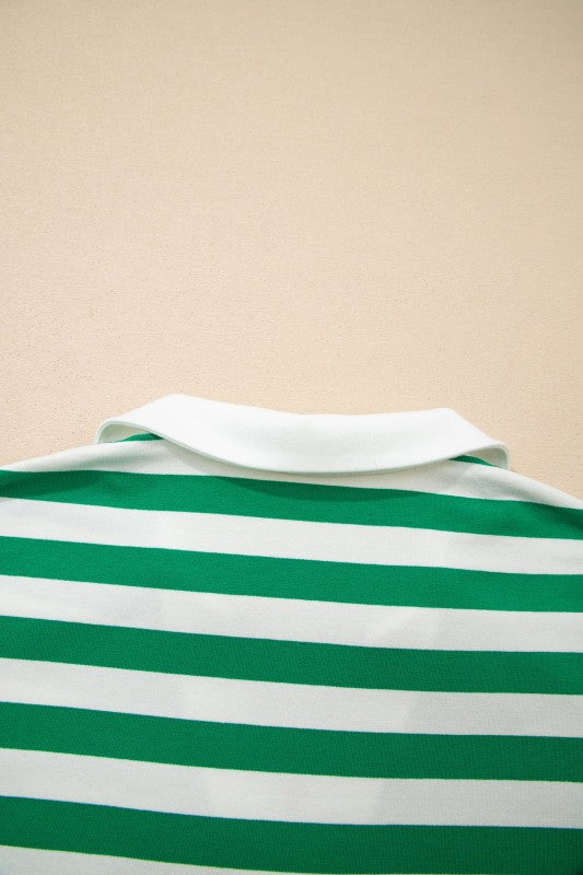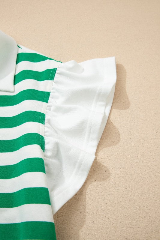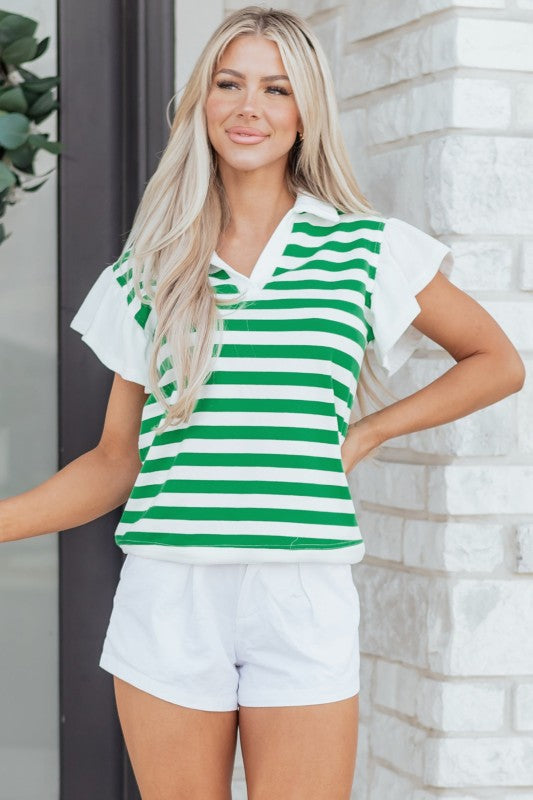 Dress in Sawyer Ruffled Short Sleeve Blouse when you want a relaxed fit that still feels polished. Striped print adds classic charm to this women’s collared V neck blouse. V neck design creates a flattering neckline for everyday wear. Ruffled short sleeves bring a soft, feminine touch to casual outfits. Lightweight fabric offers breathable comfort throughout the day. Material: 95%Cotton+5%Elastane.